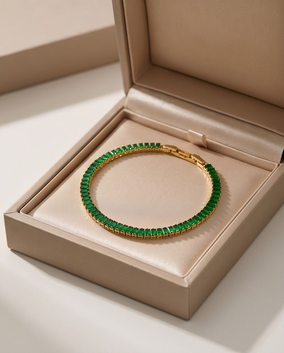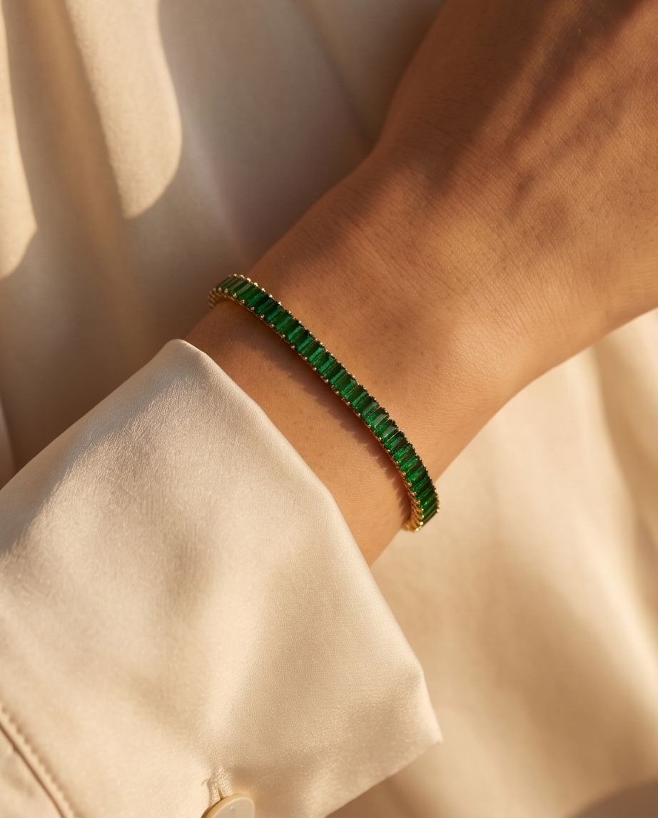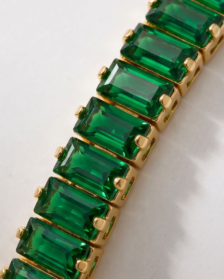 Strălucire Premium: Cristalele verzi sunt tăiate cu precizie (baguette cut) pentru a reflecta lumina într-un mod profund și elegant.