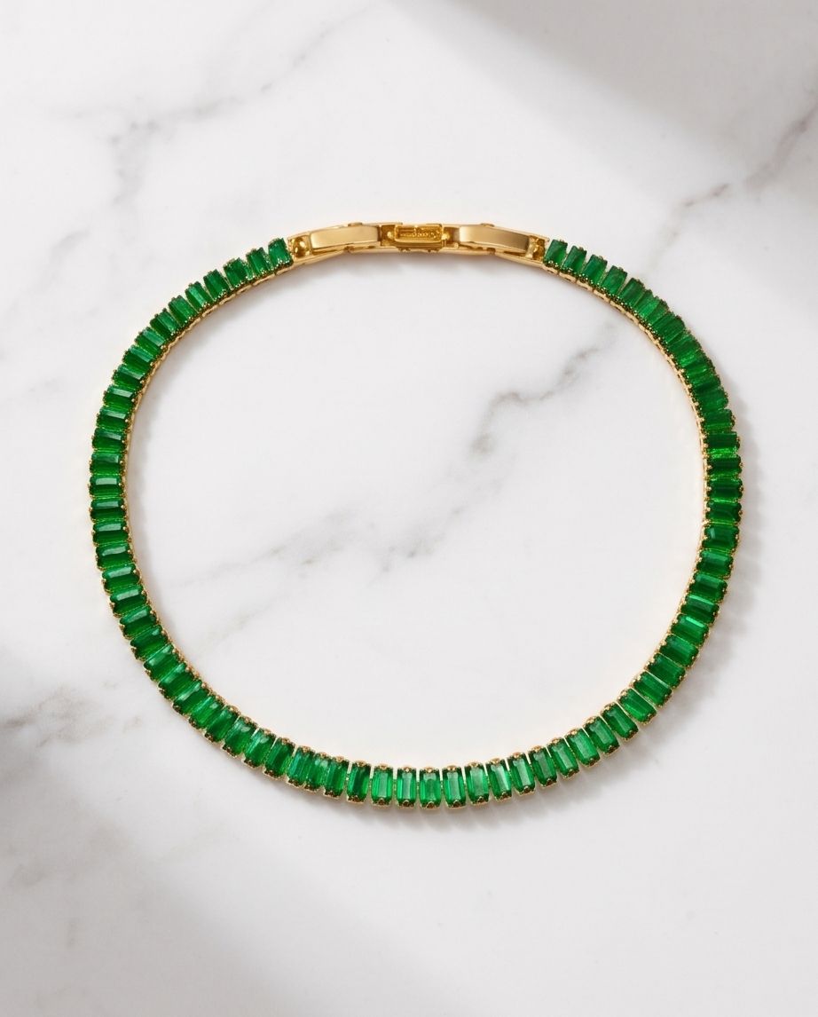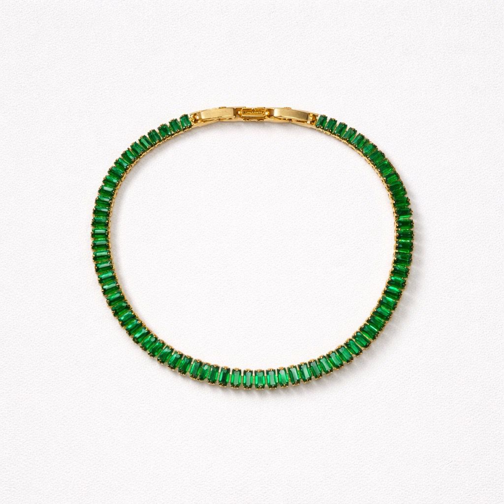 Adaugă o pată de culoare hipnotizantă ținutei tale cu această brățară spectaculoasă. Designul său clasic, decorat cu un șir continuu de cristale verzi cu tăietură dreptunghiulară, este conceput pentru a imita eleganța bijuteriilor cu smaralde naturale, oferind un look de milioane la un preț accesibil.