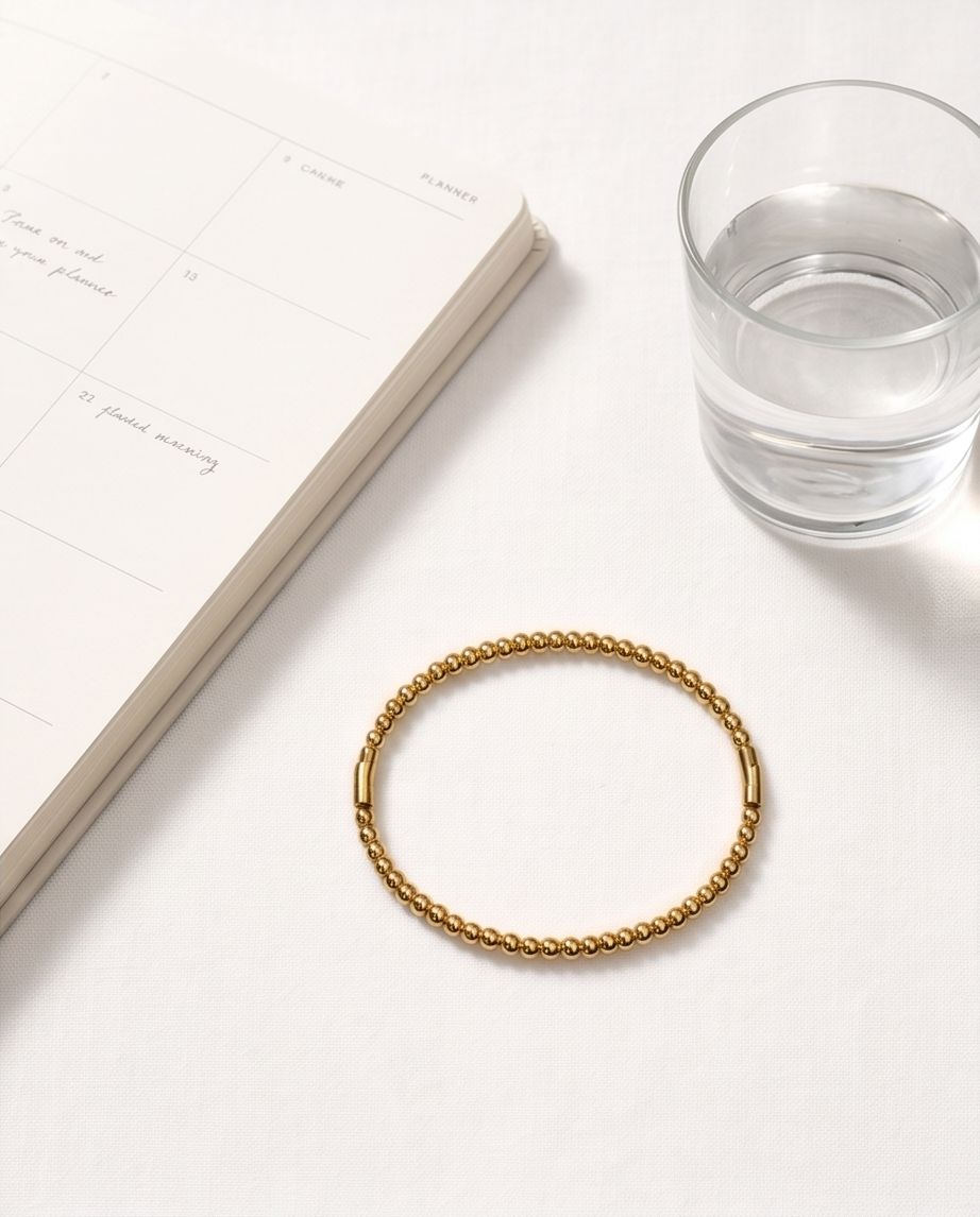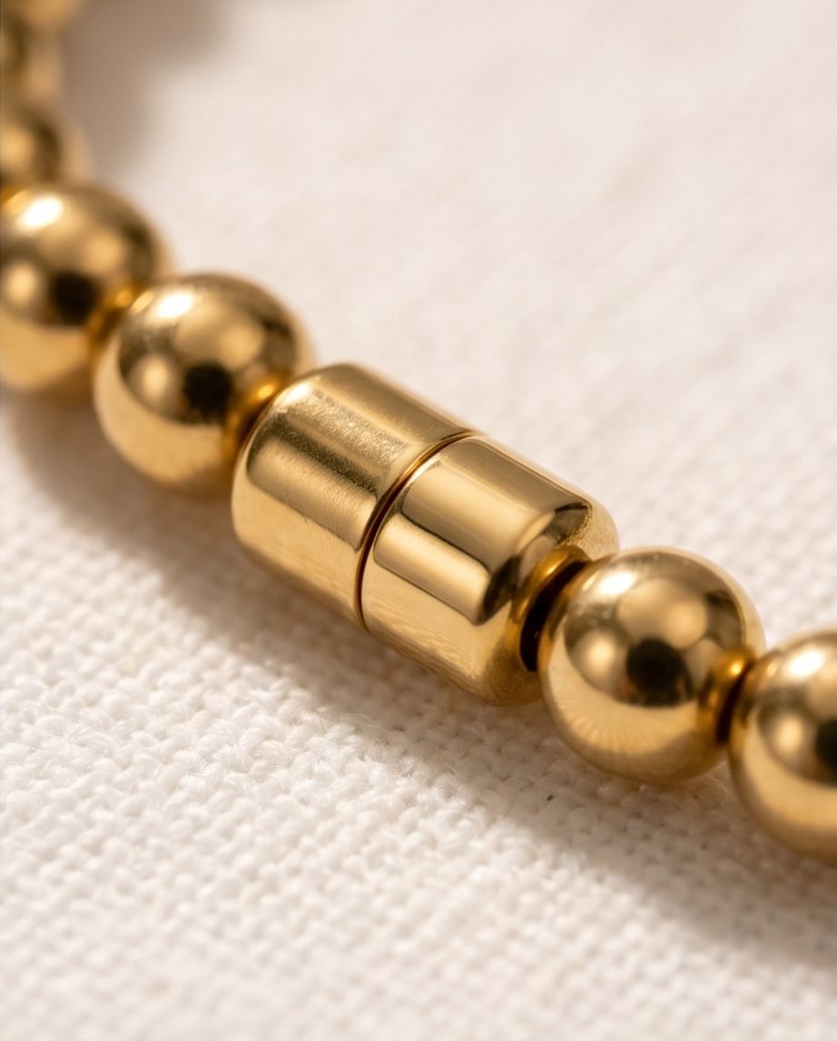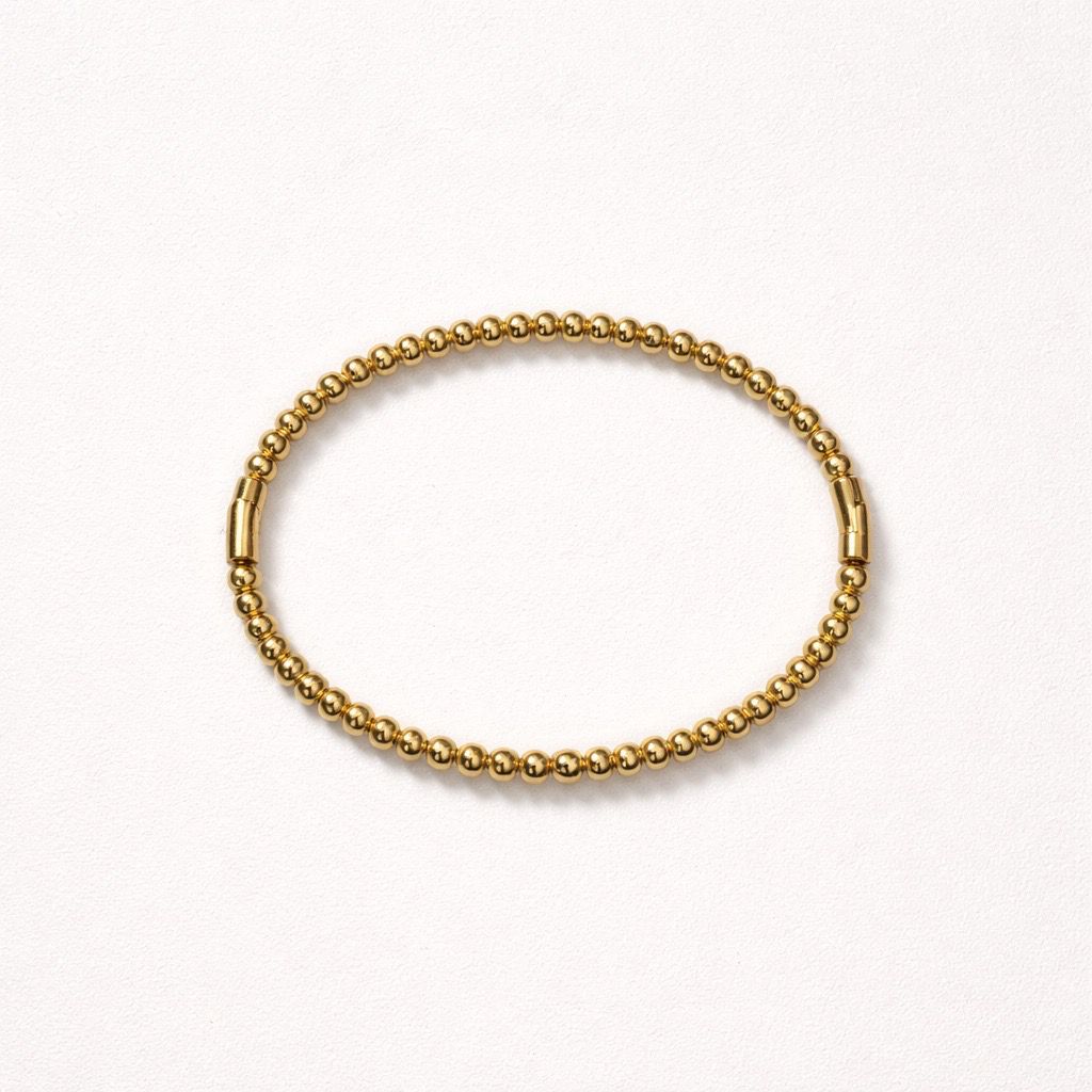 Adaugă o notă de rafinament ținutei tale cu această brățară minimalistă, formată dintr-un șir continuu de sfere aurii perfect șlefuite. Designul său clasic o face ideală pentru a fi purtată singură pentru un look discret sau alături de ceasul tău preferat.