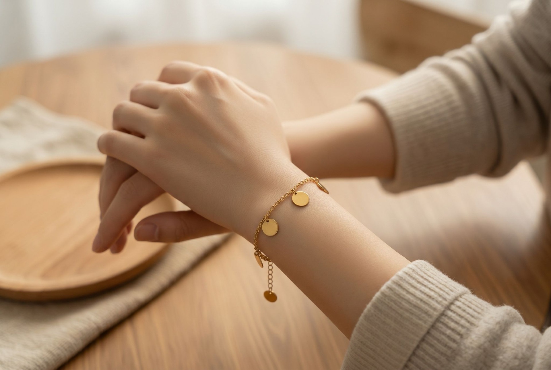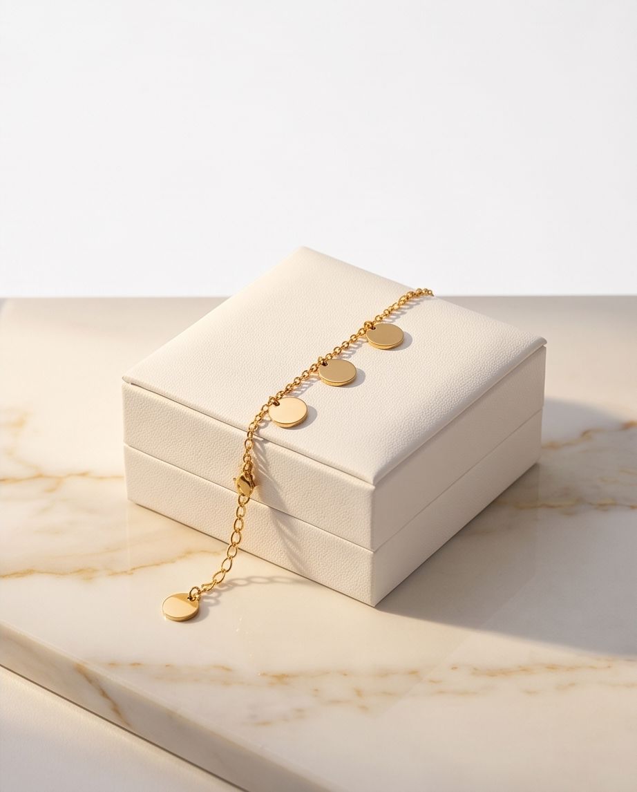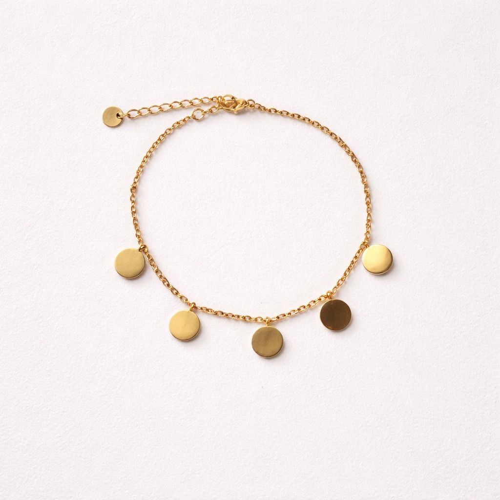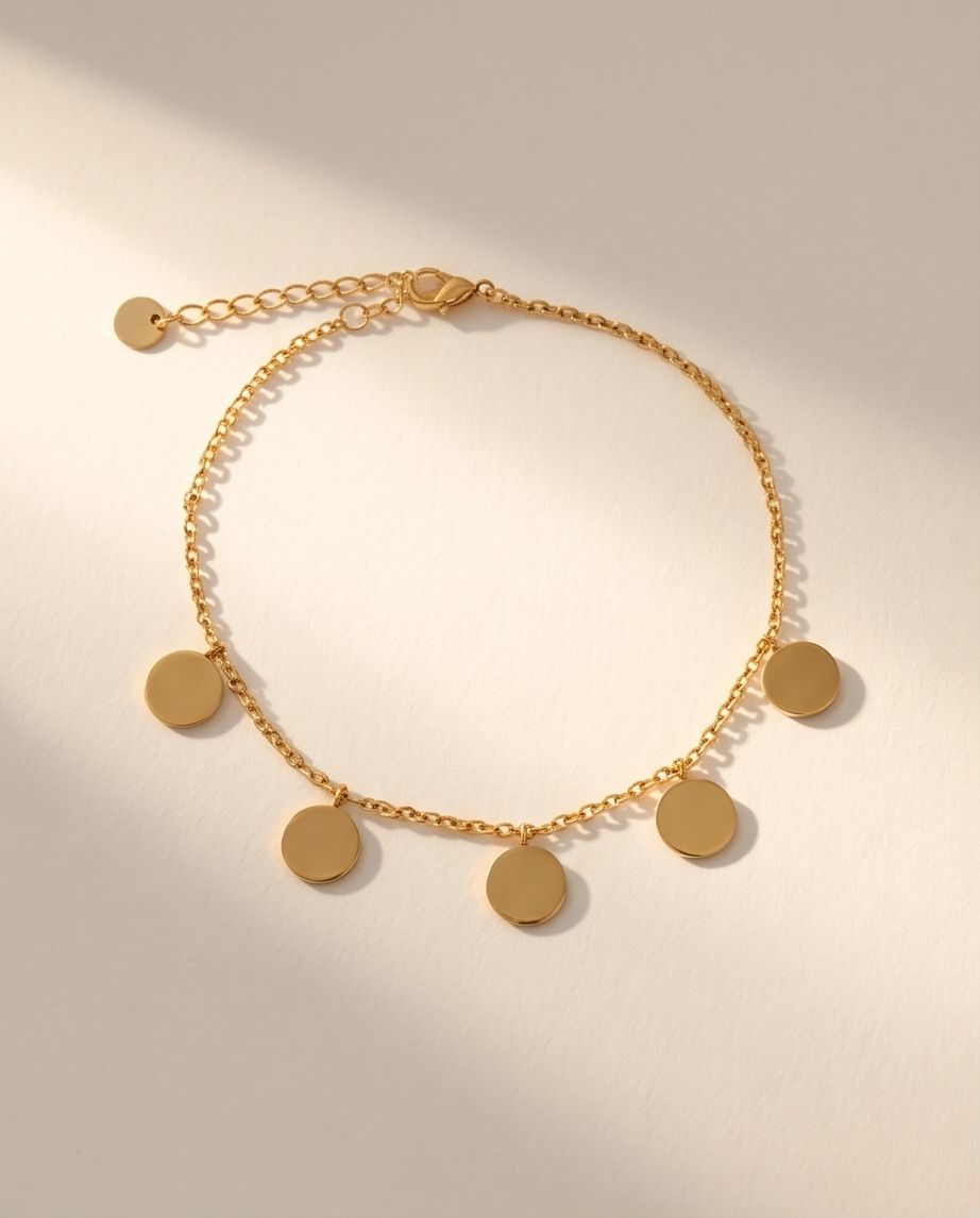 Strălucește la fiecare mișcare cu brățara Golden Coins. Un design jucăuș și elegant, decorat cu cinci bănuți delicați cu finisaj lucios, suspendați pe un lănțișor fin. Este accesoriul ideal pentru a adăuga un aer boho-chic ținutelor tale de vară sau pentru a completa un look casual de zi cu zi. ✨