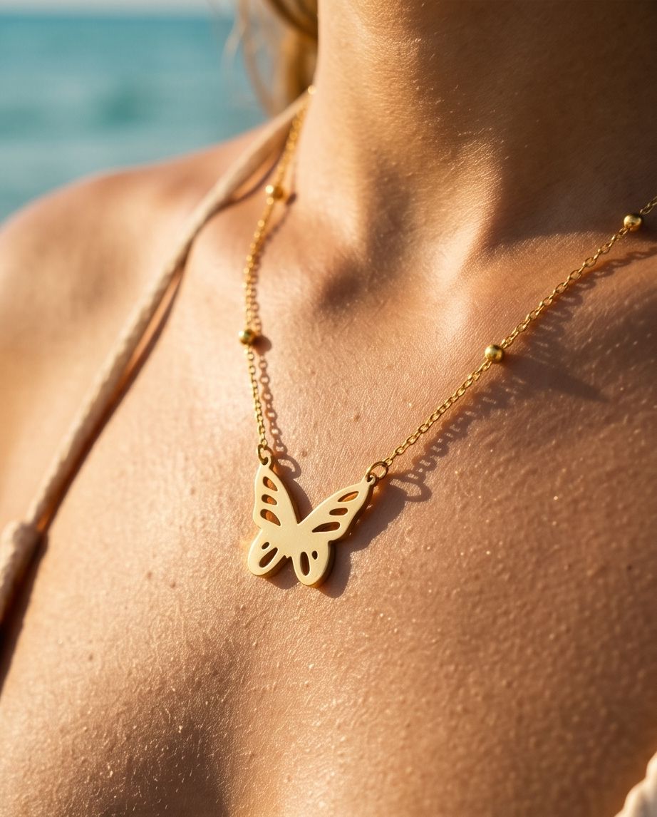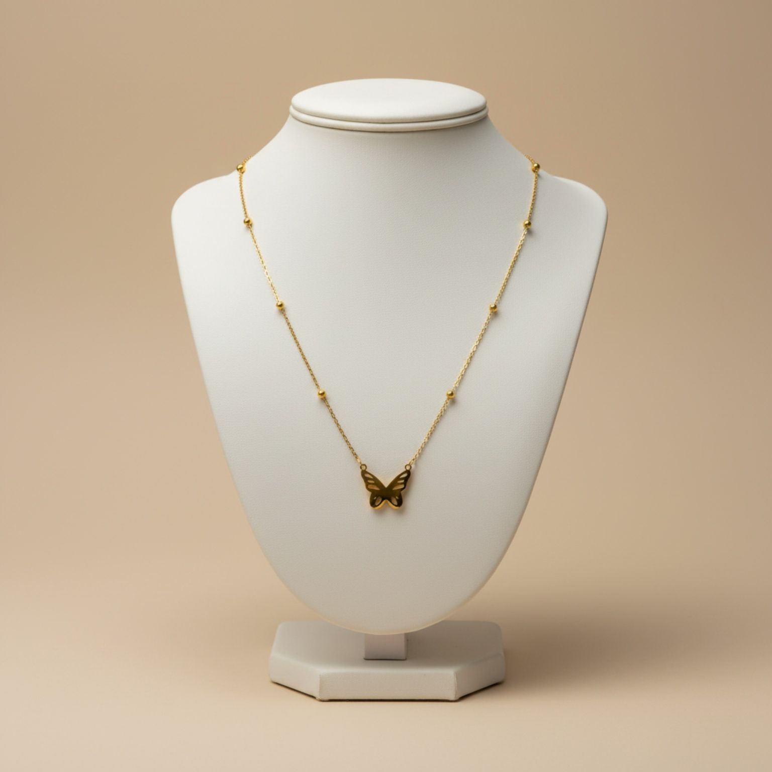 Design: Lănțișor cu mărgele intercalate și pandantiv fluture filigranat.