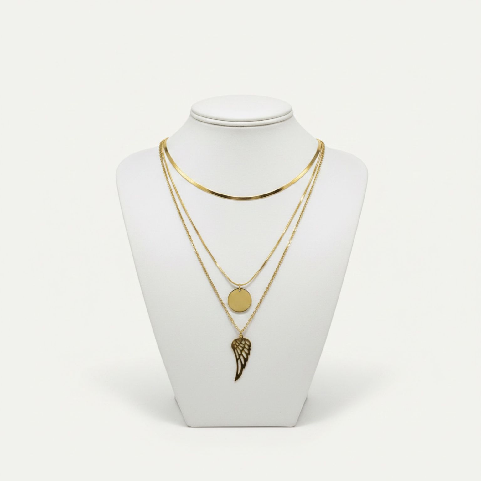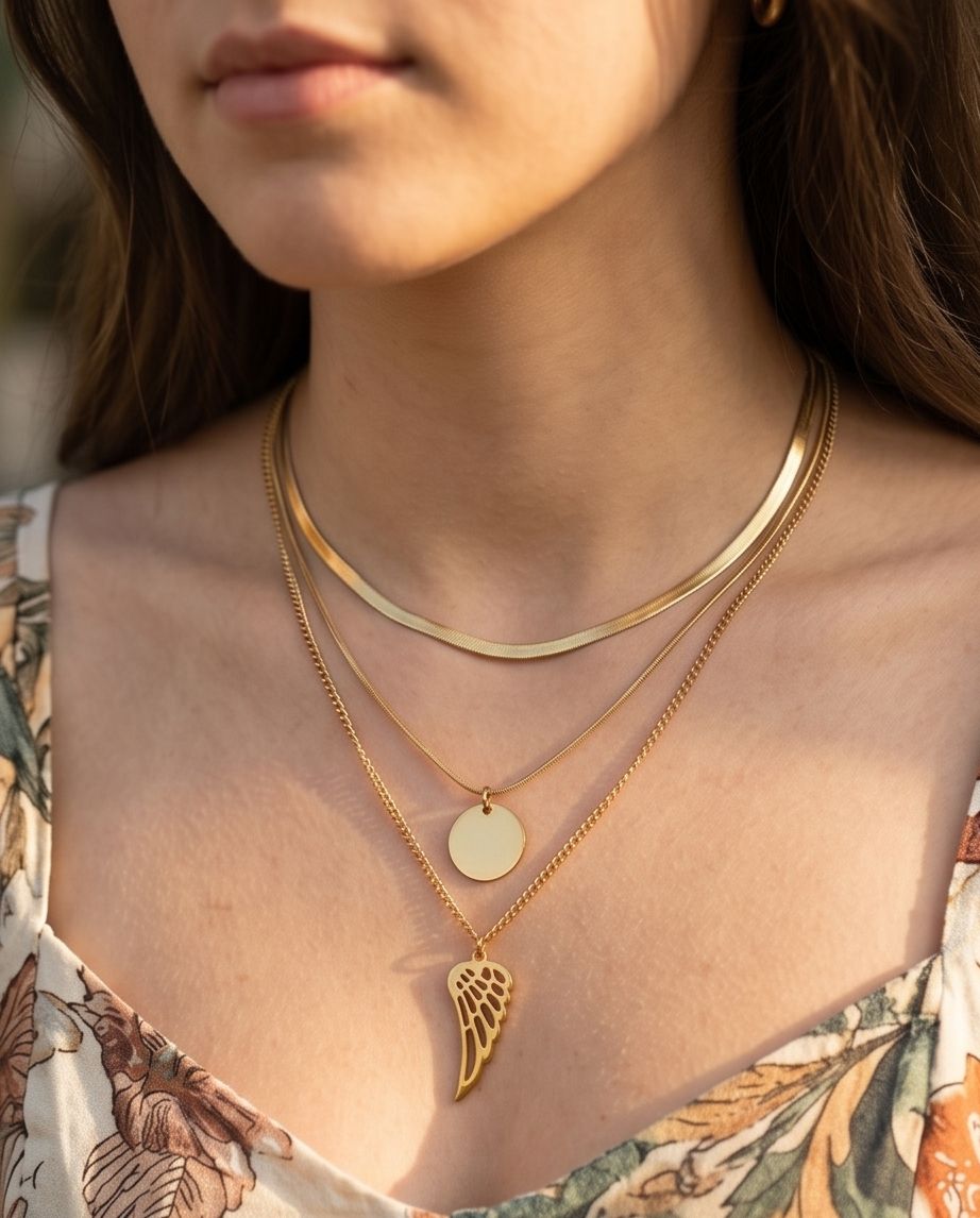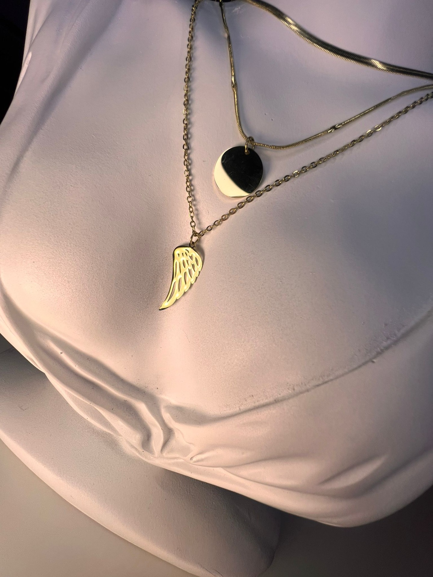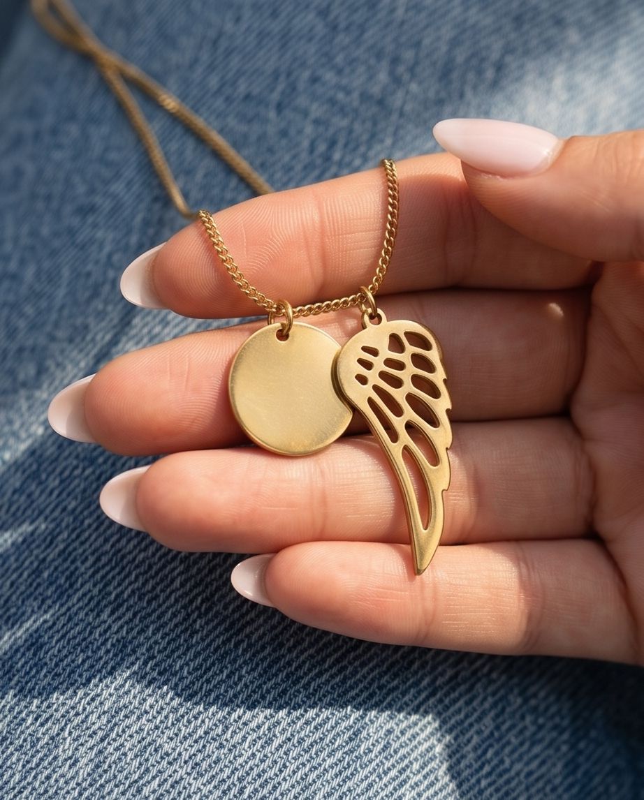 Pandantive: Disc metalic lucios și Aripă de Înger filigranată.