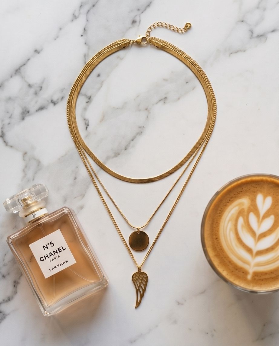 Design: 3-în-1 layered (trei rânduri de lanțuri conectate).