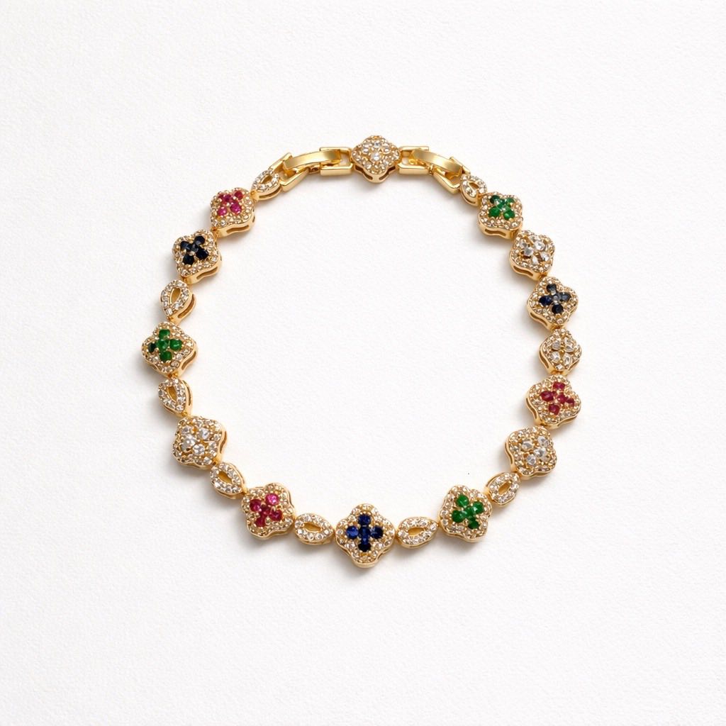 Brățara "Royal Clover Link" se remarcă prin alternanța armonioasă între trifoiul cu patru foi încrustat cu cristale colorate și zalele fin lucrate, pline de pietre mici, strălucitoare. Este o piesă care emană feminitate și succes, fiind ideală pentru persoanele care apreciază bijuteriile cu detalii minuțioase.