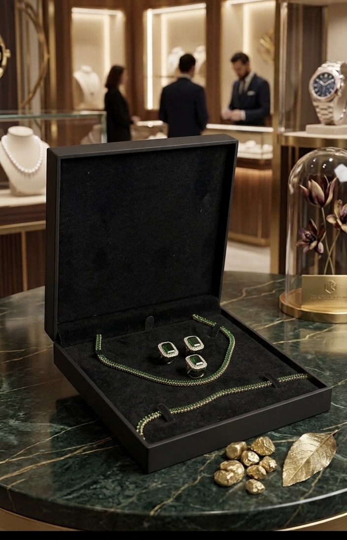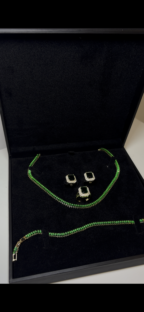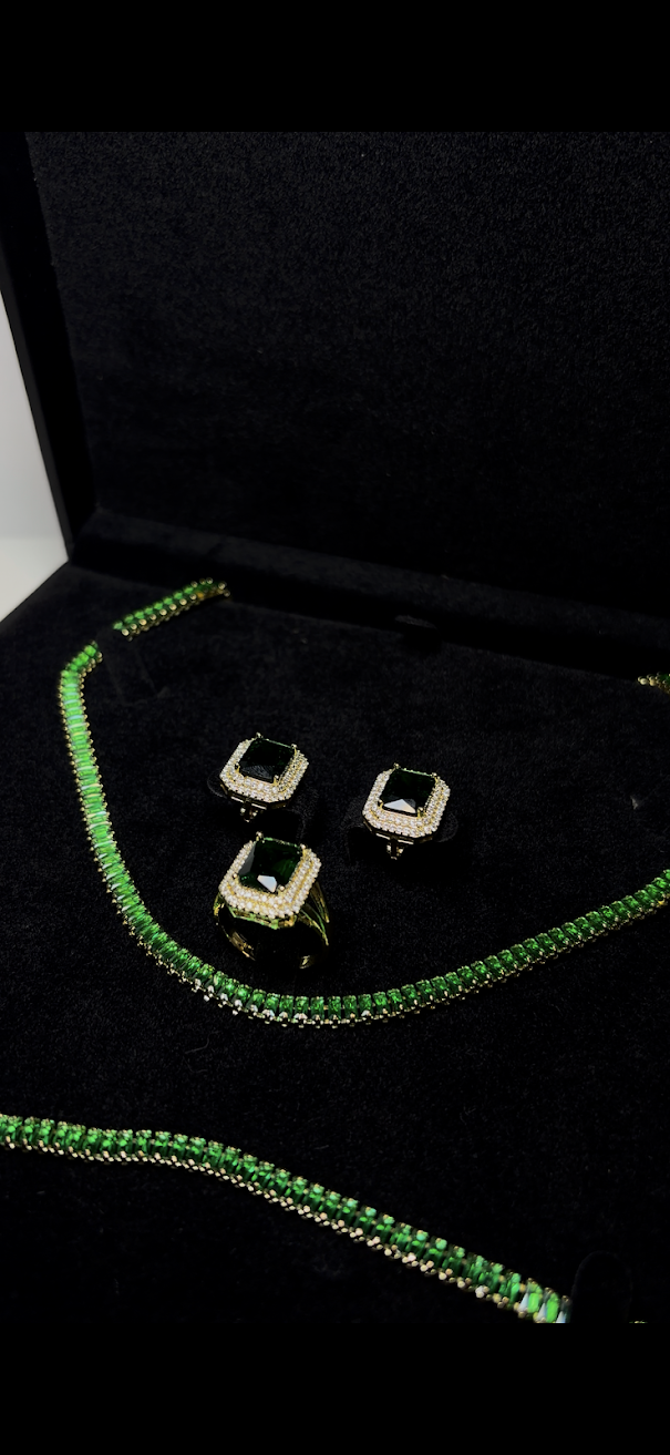 Transformă orice ținută într-o apariție memorabilă cu acest set sofisticat, inspirat de rafinamentul bijuteriilor de lux. O combinație hipnotizantă între strălucirea aurului și profunzimea cristalelor verzi.
